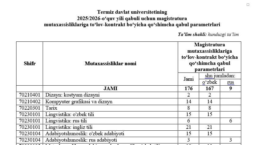 Termiz davlat universitetining 2025/2026-o‘quv yili qabuli uchun magistratura mutaxassisliklariga to‘lov-kontrakt bo‘yicha qo‘shimcha qabul parametrlari tasdiqlandi.